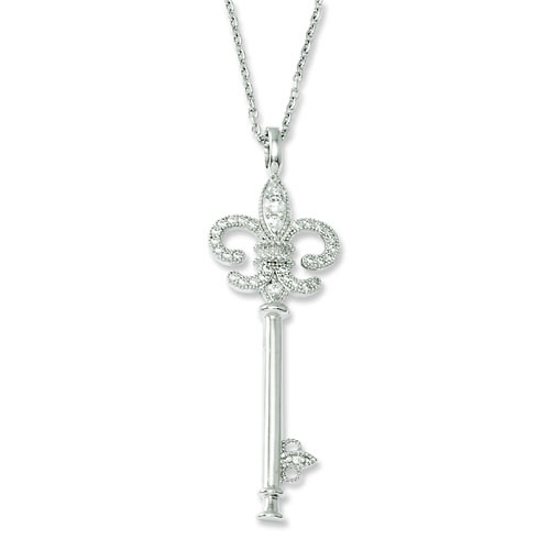 A beautifully-crafted key pendant with a CZ-lined fleur de lis design dangles along a shiny sterling silver chain necklace. This polished necklace makes a lovely fashion accessory or gift for the special woman in your life.