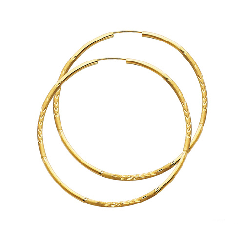 Make a radiant fashion statement with these large hoops. Crafted with genuine 14K yellow gold, these earrings stylishly display alternating sections of high polished and satin finishes with shimmering diamond cuts in an ivy design. They enclose with endless backings for a continuous round style while reducing snagging. Dimensions: Diameter = 50mm or 2 inches. Thickness = 2mm. Jewelry box included with purchase. |