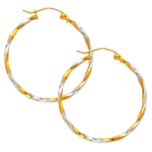 With a dynamic twist on a classic design, these large hoop earrings showcase a striking two-tone gold twisted tube style. The combination of yellow and white gold adds depth and versatility, perfectly complementing a range of fashion choices. This distinctive design brings a fresh elegance to traditional hoop earrings, making them a superb choice for enhancing any look with a touch of sophistication. Jewelry box included with purchase. |