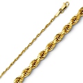 | All of our rope chain necklaces are made with genuine, solid 14K gold or sterling silver, meaning that they are made with 14K gold or sterling silver inside and out and are NOT hollow. They consist of two or more strands, twisted around each other resembling a rope. This style is one of our most popular men's necklaces. To get these silver and gold chains to glisten under the light, manufacturers use diamond cutters to create small facets, similar to diamonds, in the metal, which create a sparkle when the light hits them. Many rope chains have diamond cuts. GoldenMine offers an assortment of high quality rope silver chains, yellow and white gold chains, and two tone gold chains. You can also find other gold chain styles, such as gold figaro chains, mariner, and Cuban silver chains, at prices that you can afford. |